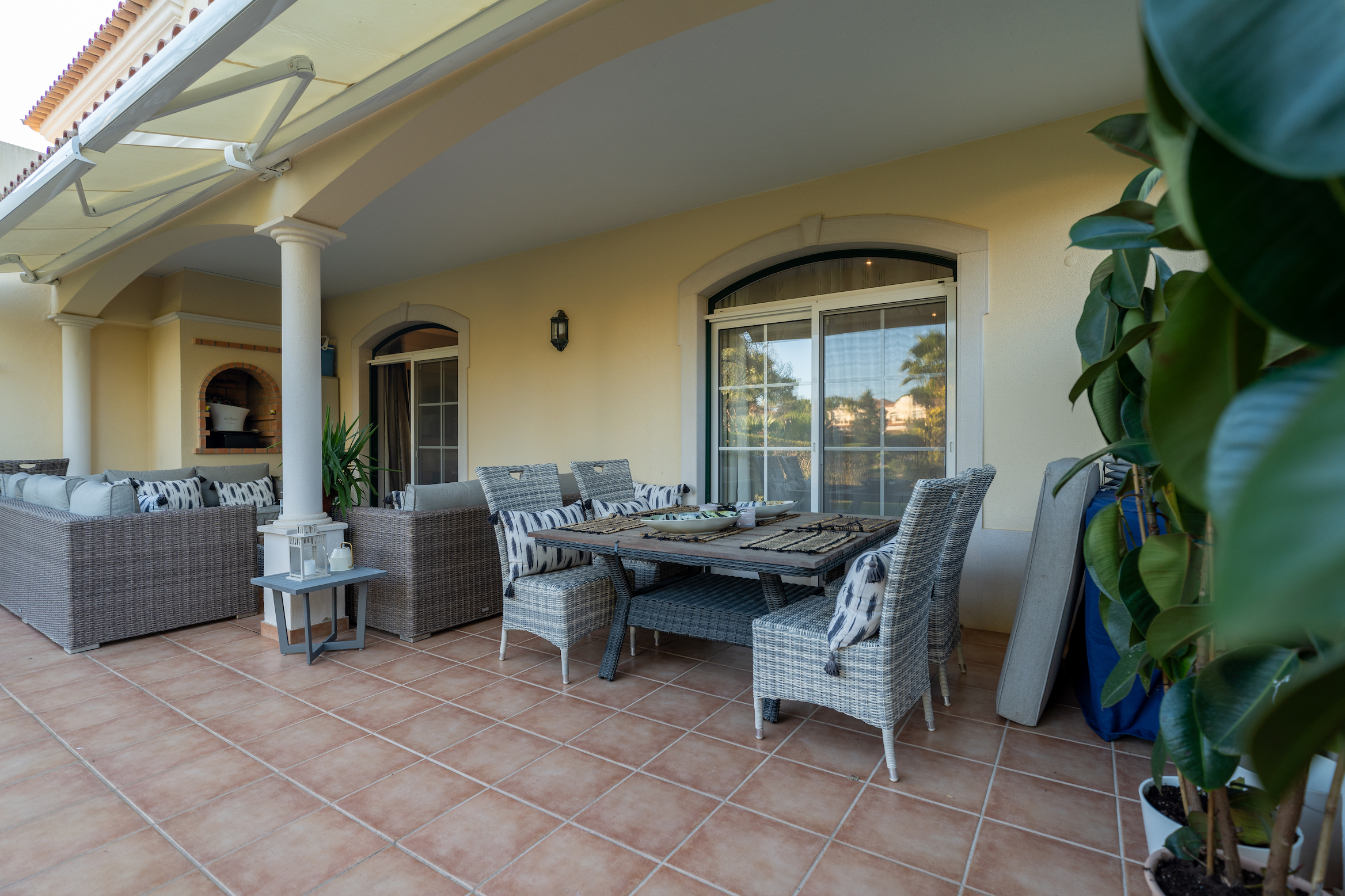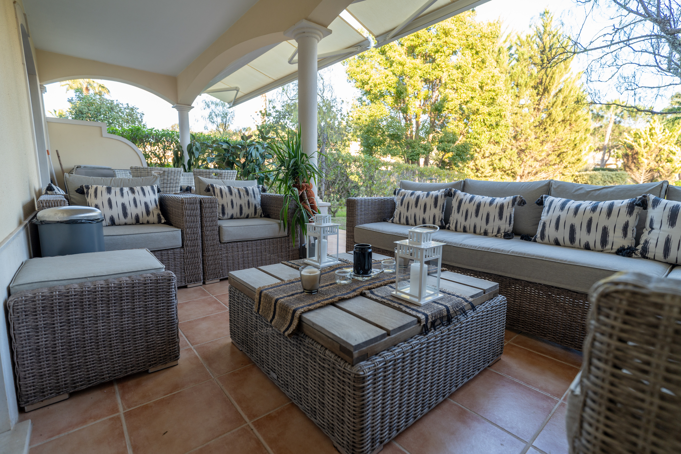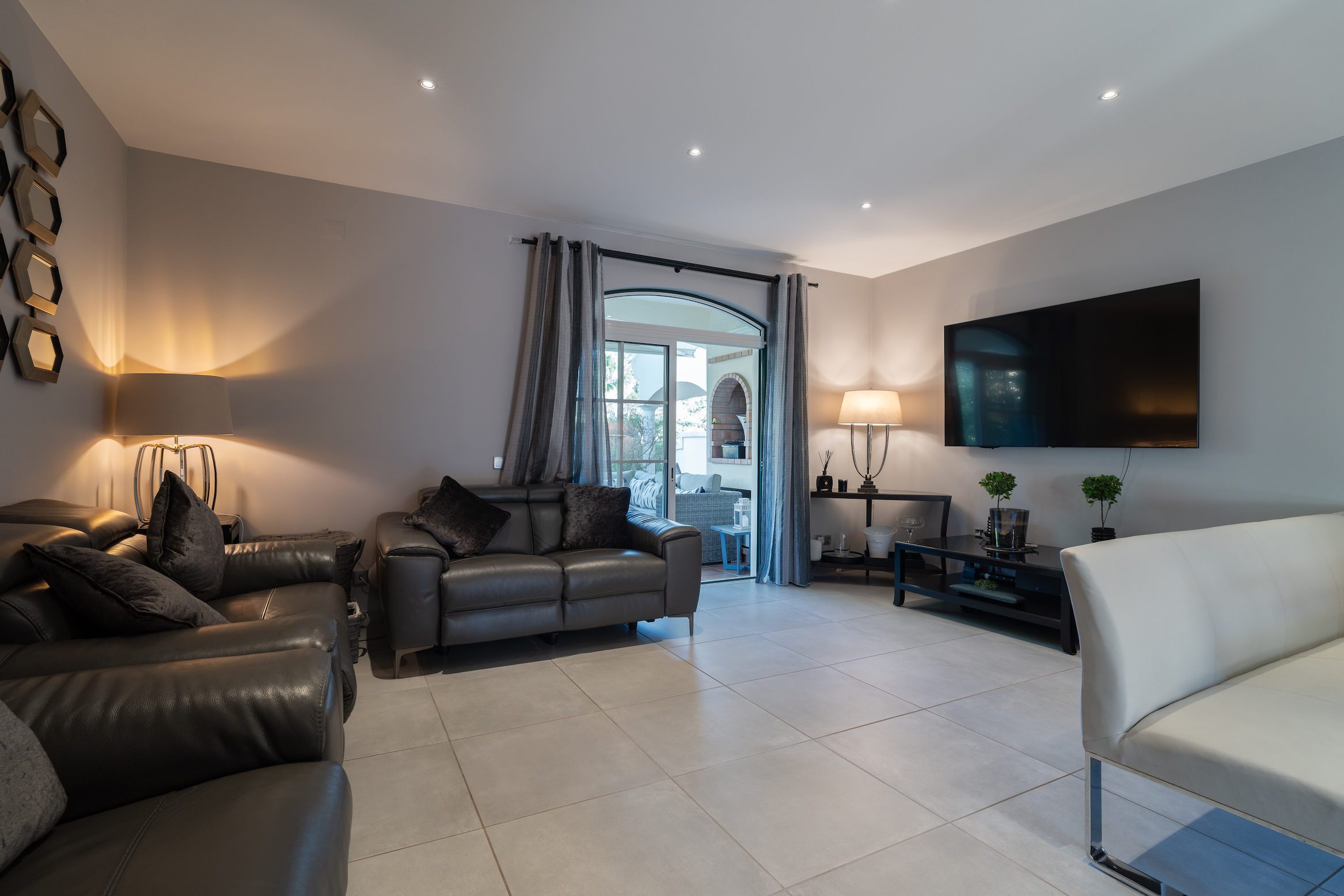 This renovated three-bedroom townhouse in Vale dos Pinheiros, Quinta do Lago, offers serene living with lawned areas amidst landscaped cummunal gardens blending effortlessly.